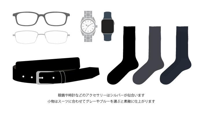 ベルトや靴などの小物も洋服に合わせて、ネイビー系や黒、シルバーにすると統一感が出て清潔に見えます。